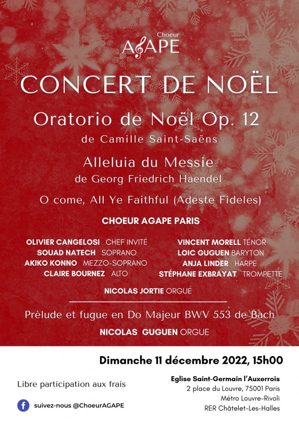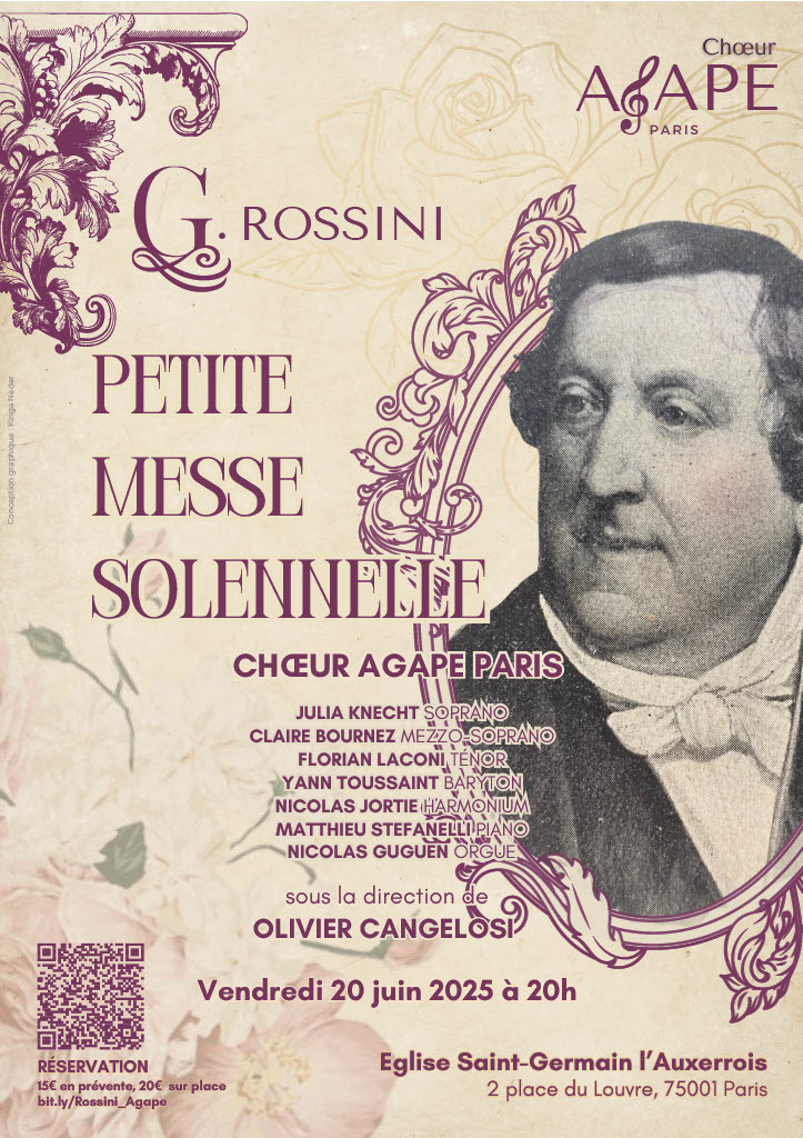 Composé d’une soixantaine de chanteurs de nationalités diverses, le Chœur Agape Paris travaille le répertoire de la musique sacrée sous la direction de son chef, Olivier Cangelosi : Passion selon Saint-Jean, Gloria de Vivaldi, Petite Messe solennelle de Rossini… et Messe en Si de Bach, programmée en 2026.