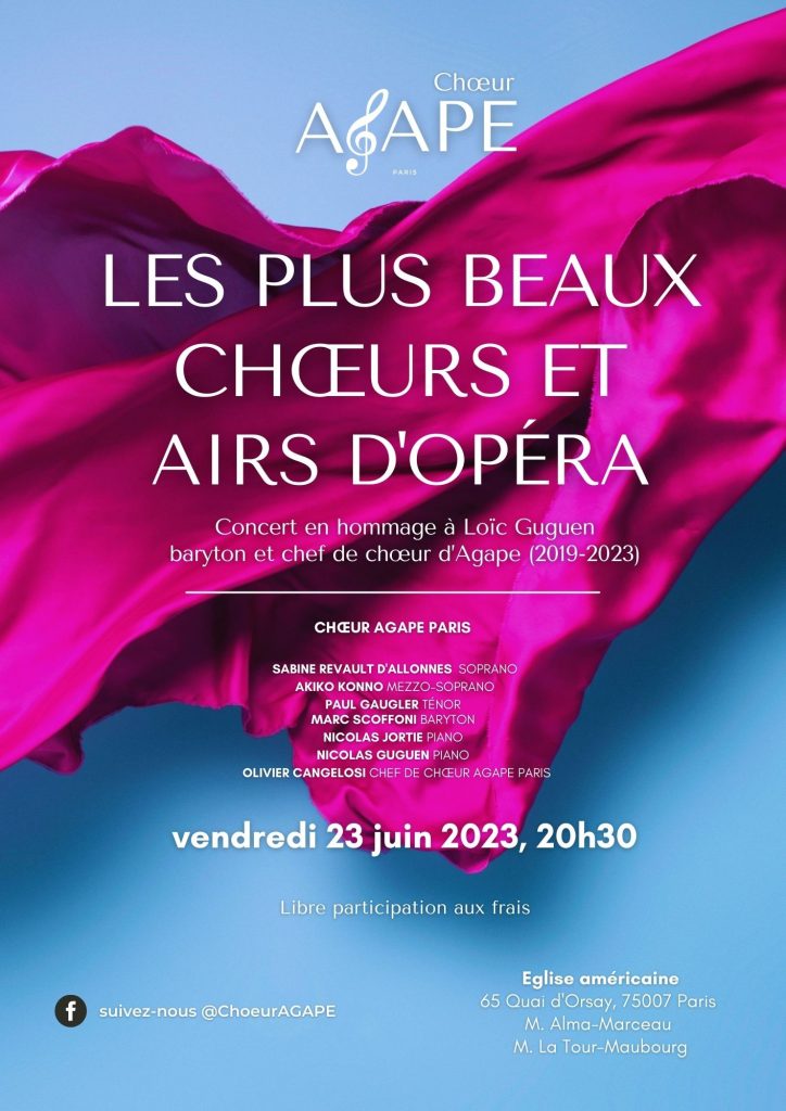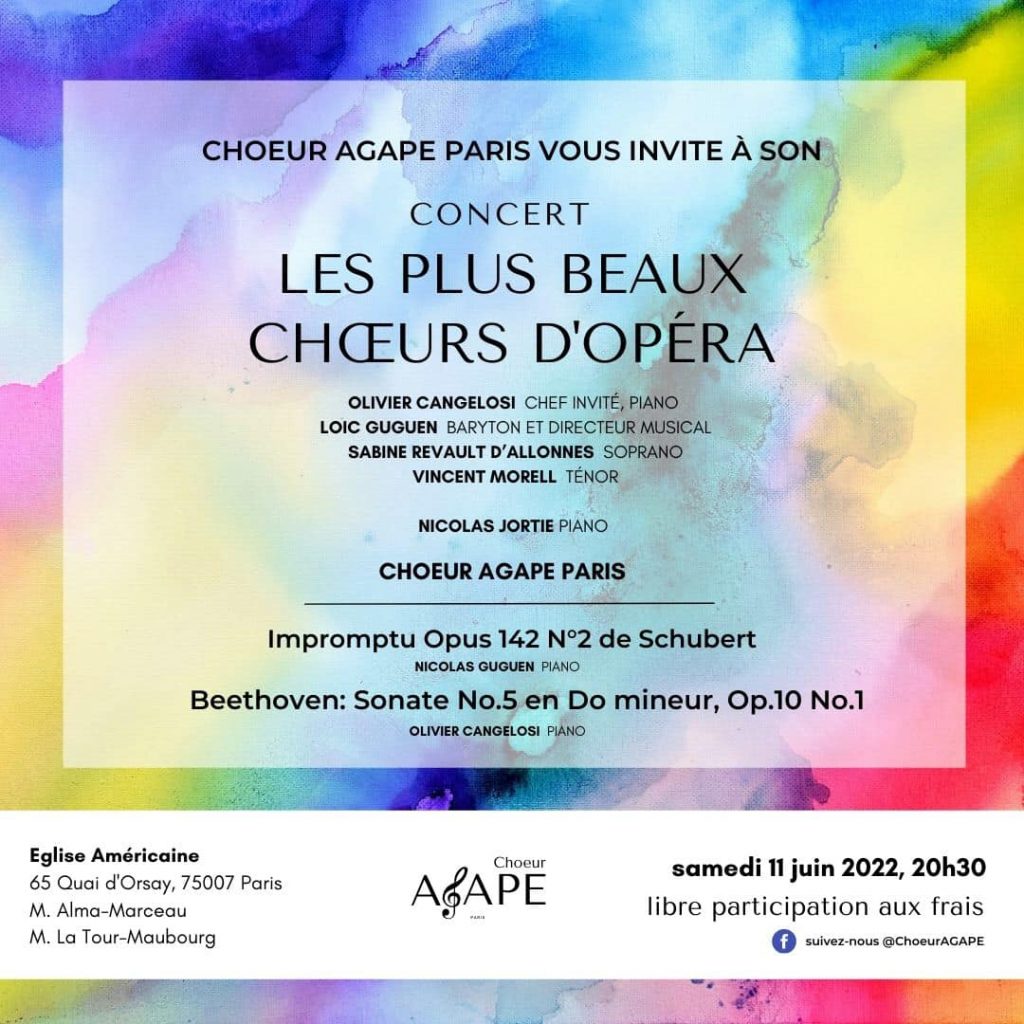 Chœur international créé en 2016, le Chœur Agape Paris a été fondé par Italo Marchini, qui l’a dirigé jusqu’a 2019, quand le baryton professionnel Loïc Guguen en a repris la direction. Il est actuellement dirigé par Olivier Cangelosi.